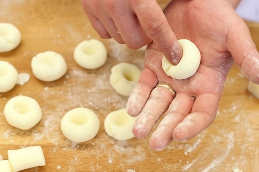 Wałek ciasta podziel na małe kwadraty. Potem dłońmi uformuj z każdego kwadratu niewielką kulkę. Spłaszcz ją lekko w rękach i palcem wykonaj w środku zagłębienie.