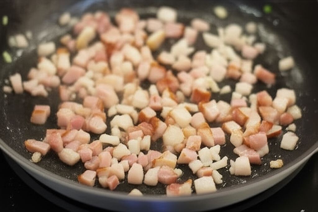 Boczek i cebulę posiekaj na drobne kawałki. Potem smaż na patelni, aż cały tłuszcz się wytopi, przypraw Majerankiem Knorr.