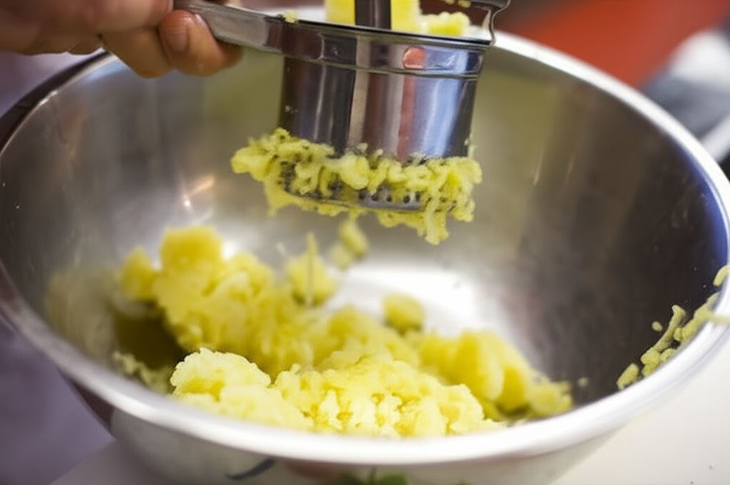 Ziemniaki ugotuj, ostudź i przepuść przez praskę.