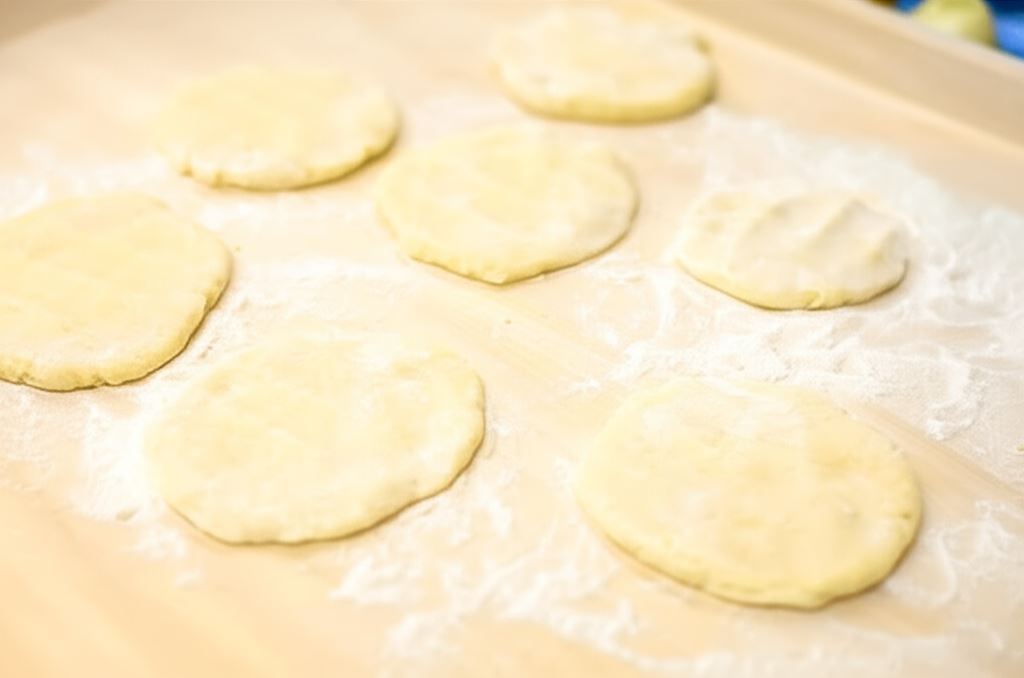 Przygotowane ciasto podziel na porcje, po czym na stolnicy uformuj z każdej porcji wałek. Odcinaj po kolei małe kawałki i kształtuj niewielkie placuszki.
