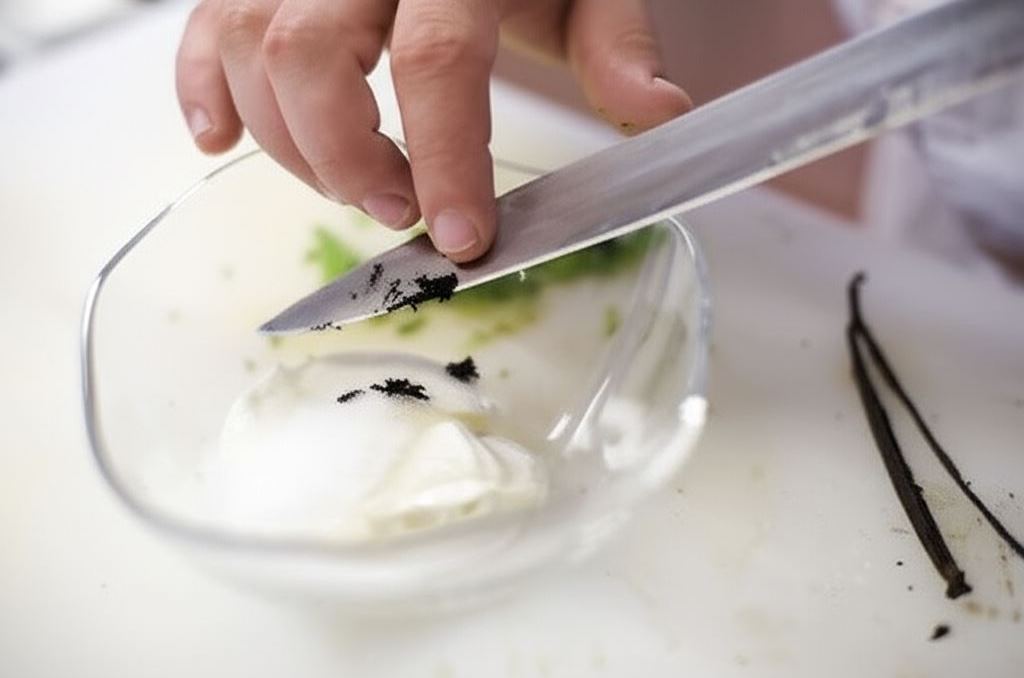 W miseczce połącz śmietanę z cukrem oraz ziarenkami wyłuskanymi z przeciętej laski wanilii. Ugotowane knedle oblej przygotowaną śmietaną i przystrój listkami świeżej mięty.