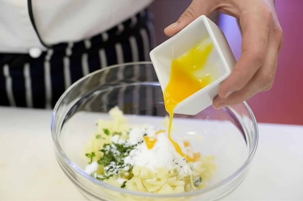 Wymieszaj ziemniaki, zioła, mąkę ziemniaczaną i żółtka, wsyp przyprawy i wyrób ciasto. Odłóż przykryte na 20 minut.