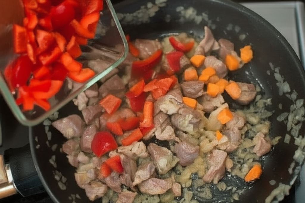 Mięso, paprykę i marchew pokrój w dużą kostkę. Cebulę posiekaj, rozdziel na dwie części. Jedną z nich zrumień na oleju, dodaj mięso i smaż, aż będzie całkowicie suche. Wrzuć marchew i paprykę, smaż jeszcze moment, mieszając od czasu do czasu.