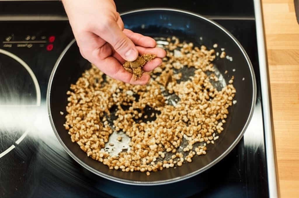 Ugotuj kaszę. Na patelni zrumień resztę cebuli, wsyp kaszę i dodaj Bulionetkę wołową Knorr. Wszystko starannie zamieszaj, by kostka się rozpuściła. Kaszę możesz przyprawić niewielką ilością majeranku.