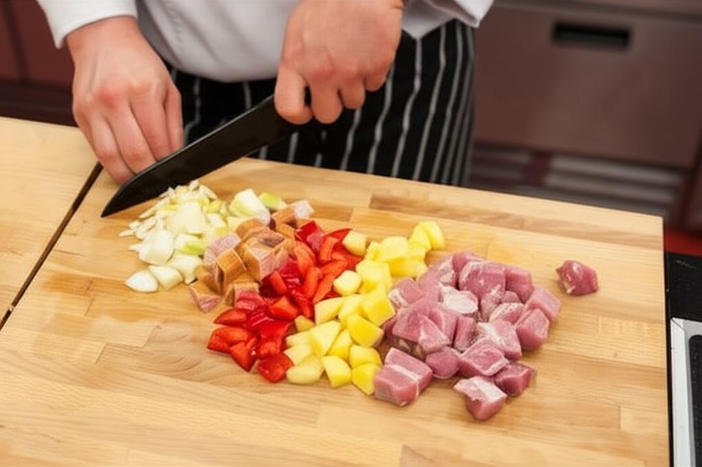 Mięso, ziemniaki, paprykę, kiełbasę i cebulę potnij w kostkę o wymiarze około 1,5 cm. Czosnek drobno posiekaj.