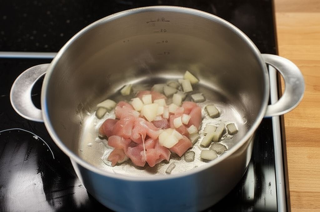 Mięso oraz cebulę pokrój w kostkę, po czym zrumień w nagrzanym rondlu.
