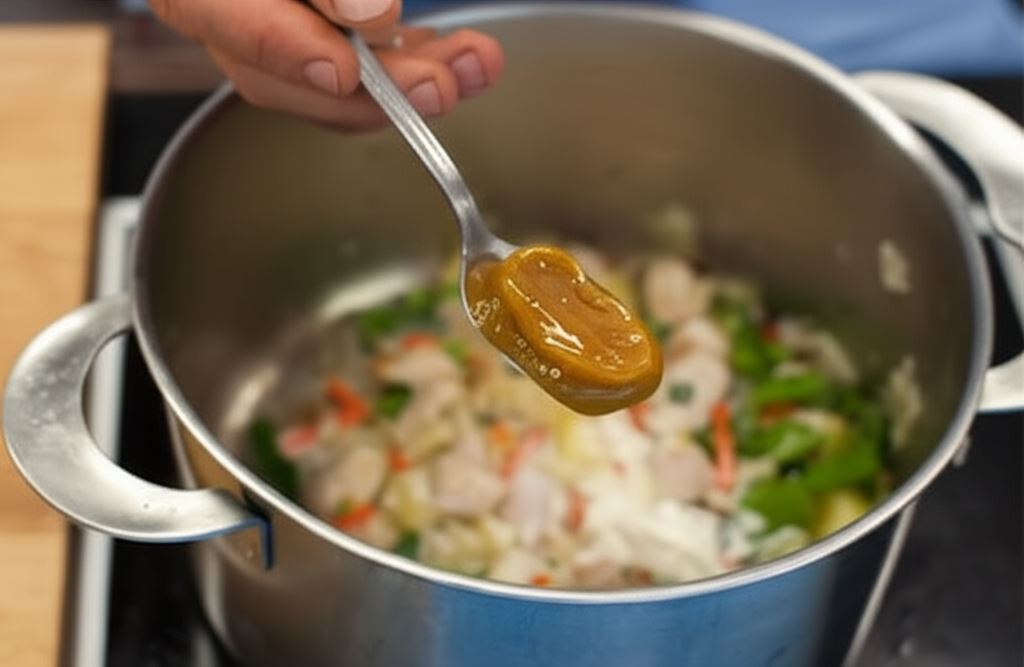 Dodaj śmietankę i wsyp kostkę Rosół z kury Knorr, która doskonale przypawi danie i nada mu pełny smak. Całość gotuj, aż potrawa delikatnie zgęstnieje.