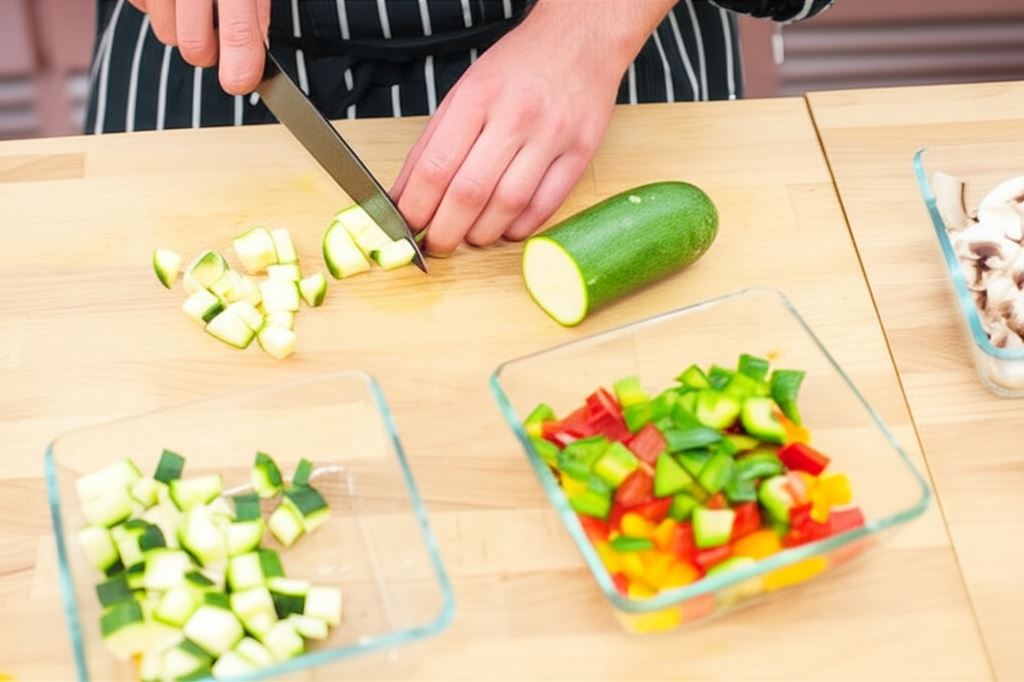 Oczyść kabaczka i pokrój w kostkę, tak samo papryki.
