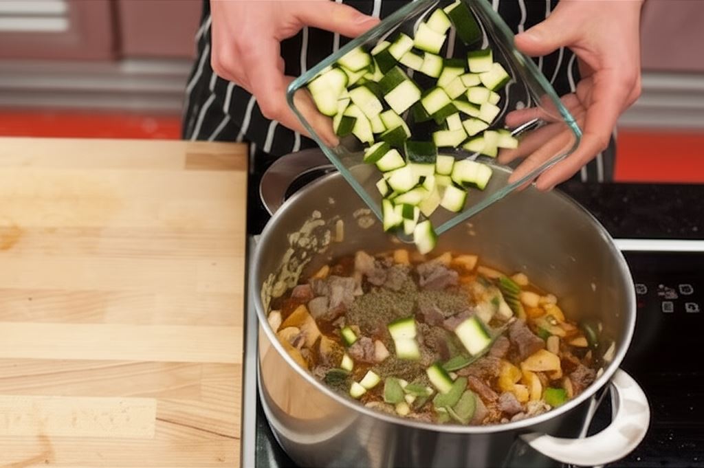 Dołóż mięso, kabaczek i resztę przypraw, duś 20 minut od czasu do czasu zamieszaj.