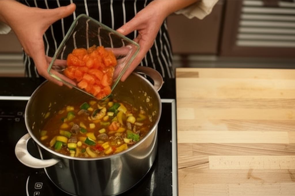 Przy końcu duszenia wsyp pomidory i starannie zamieszaj. Na zakończenie posyp siekaną natką pietruszki.