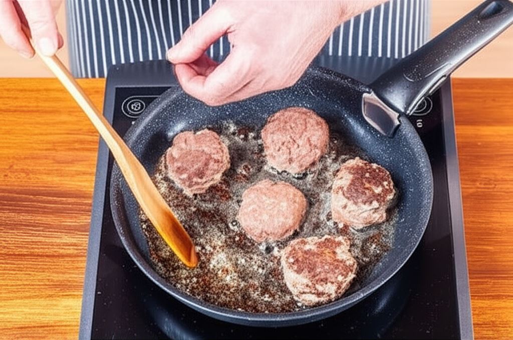 Rozgrzej olej na patelni i smaż klopsiki po obu stronach około 4 min. Serwuj z ryżem lub frytkami.