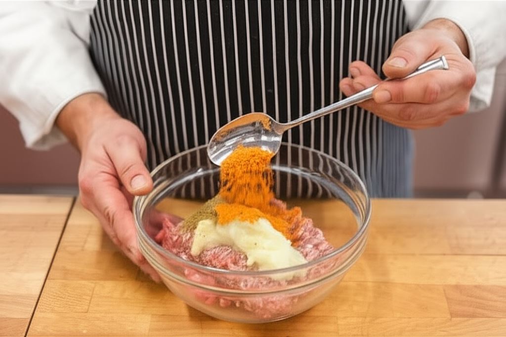 Mięso mielone wymieszaj z Przyprawą do grilla Knorr, kminkiem oraz startą cebulą. Mięso starannie wyrób, aby tworzyło jednolitą masę.