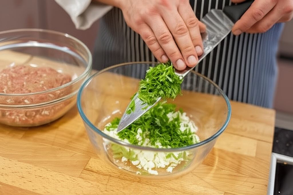 W innej misce wymieszaj pokruszony ser feta z posiekaną kolendrą, miętą i oliwkami, powstałą mieszankę połącz. Może ona posiadać różną konsystencję, zależnie od pochodzenia sera. Nadzienie z polskiego sera będzie kremowe, z greckiego - znacznie bardziej suche.
