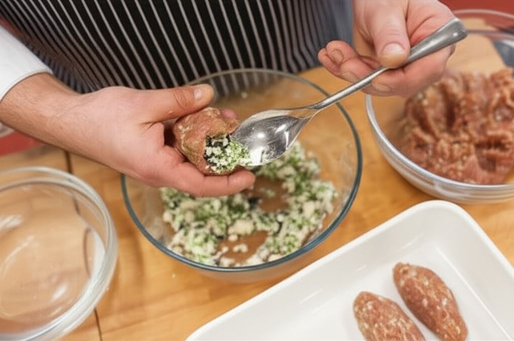 Weź do zamoczonej w zimnej wodzie dłoni porcję mięsa mielonego, uformuj z niego (naciągając na kciuk prawej ręki) owalny kotlet z otworem w środku. Do wnętrza kotleta włóż farsz serowy. Zamknij kotlety dokładnie z obu stron.