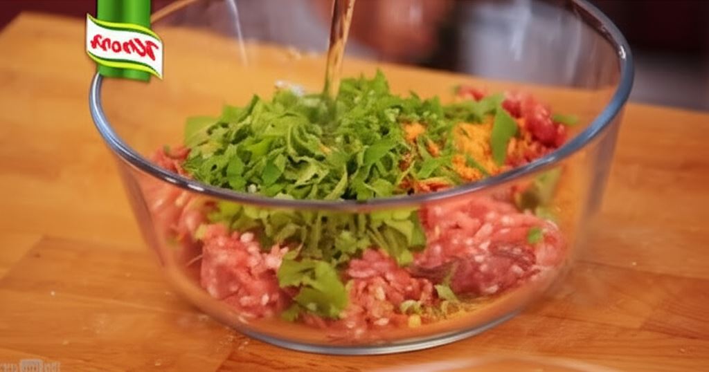 Najpierw przystąp do przygotowania mięsa do sałatki Fattoush. Do obszernej miski wsyp 400 gramów mielonego mięsa i połącz je z łyżką posiekanej mięty i łyżką natki pietruszki. Potem pokrój cebulę w kostkę i dorzuć do reszty składników w misce. Dodaj również zawartość opakowania Fix Kebab z sosem czosnkowym Knorr (wyłącznie część przeznaczoną do mięsa – sosem zajmiesz się później). Ponownie starannie wymieszaj, by składniki się połączyły.