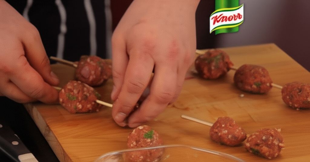 Do przygotowanej masy z mięsa dodaj około 100 mililitrów wody i dokładnie wymieszaj. Potem weź na dłoń niewielkie porcje mięsa i uformuj kulki. Nałóż je na patyki szaszłykowe i opiecz na grillu lub usmaż na patelni, aż uzyskają złotobrązową barwę. Po usmażeniu odłóż je na później.