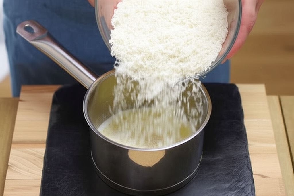 W rondelku ogrzej masło z śmietanką. Wsyp wiórki kokosowe i wszystko gotuj na małym ogniu aż zgęstnieje. Umieść w misce.