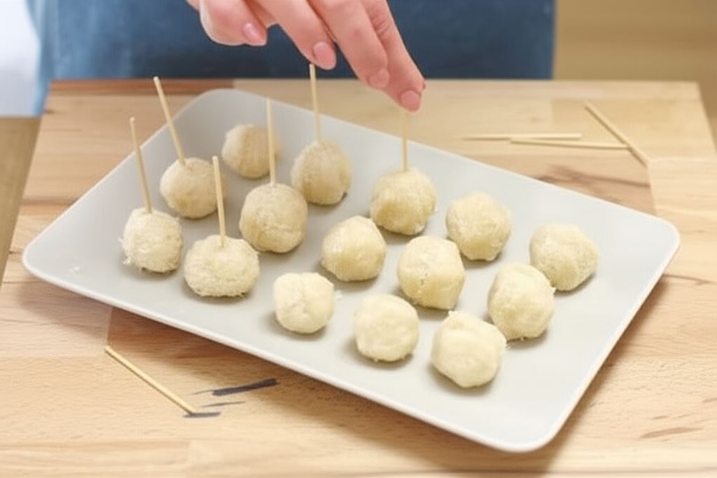 Z uzyskanej masy uformuj kulki o wielkości orzecha włoskiego i wbij w każdą wykałaczkę. Schładzaj przez kolejną 1h.