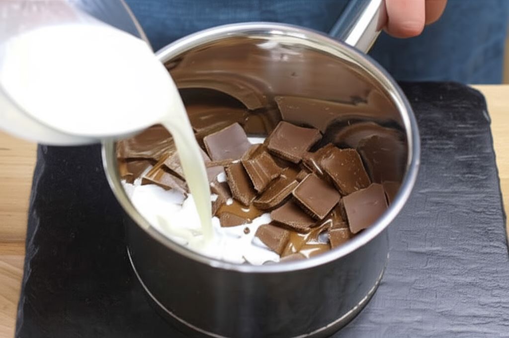 W garnku, ogrzewając na płomieniu wymieszaj śmietankę z mleczną czekoladą. Nie dopuść aby się zagotowało.