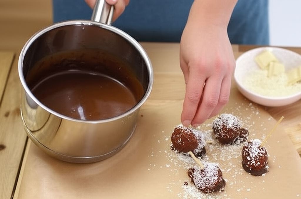 Przygotowane kule zanurz w ciepłej polewie czekoladowej i posyp wiórkami białej czekolady.