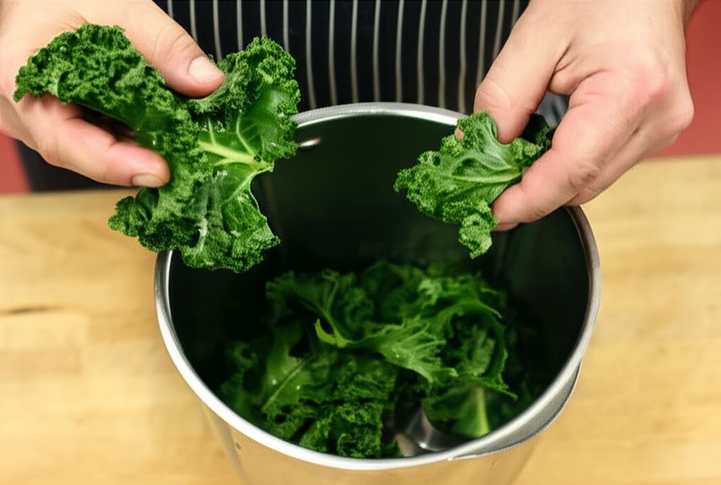 Jarmuż przepłucz pod bieżącą wodą, podrzyj na mniejsze części, umieść w blenderze.
