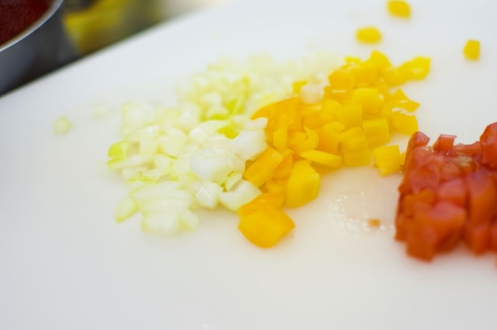 Pomidory, ogórki, cebulę i paprykę pokrój w kostkę o jednakowej grubości.