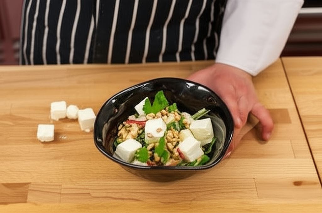 Ser pokrój w kostkę o boku 1 cm i razem z prażonymi orzeszkami posyp wierzch sałatki. Przystrój gałązką pietruszki.