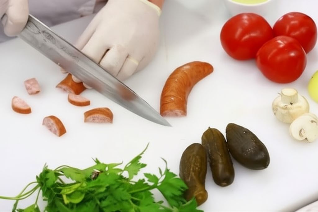 Potnij kiełbasę, ogórki i pieczarki na plastry. Przetnij cebule na połówki i posiekaj je wzdłuż na cienkie plasterki. Pomidory pokrój w dużą kostkę.