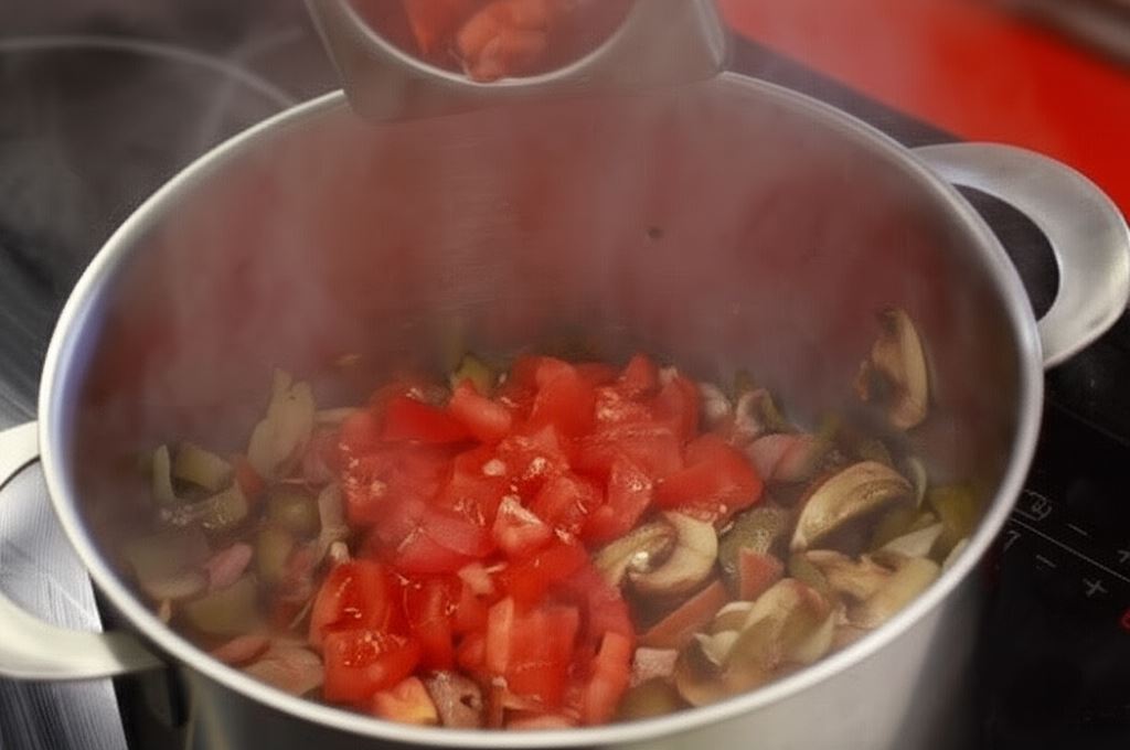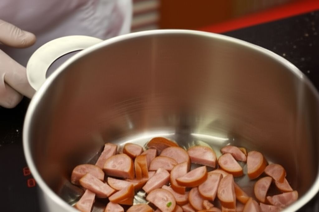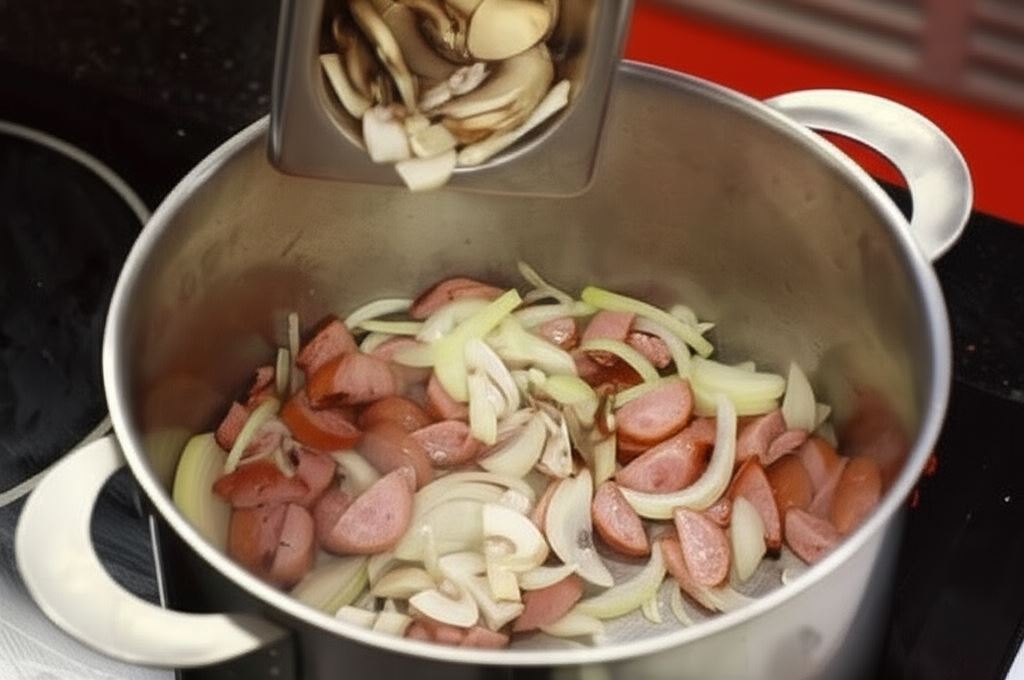 Podgrzej w garnku olej i przysmaż po kolei: kiełbasę, cebulę, pieczarki, ogórki i pomidory.