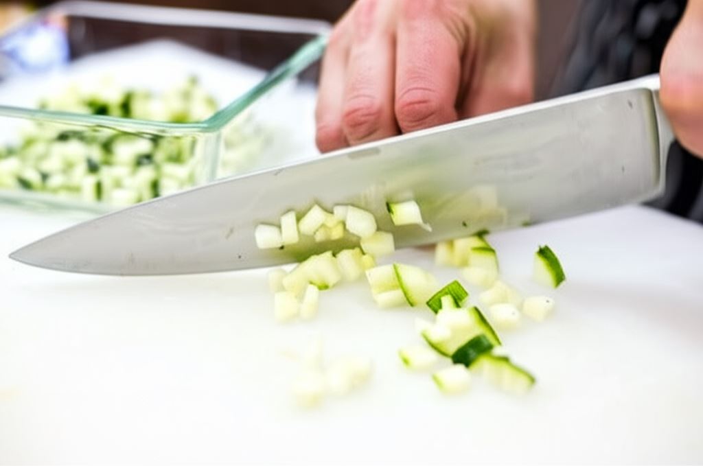 Cukinię przekrój wzdłuż na połowę, potem jeszcze raz wzdłuż na pół. Usuń część nasienną, a pozostałą zieloną część pokrój w kostkę, podobnie jak paprykę.