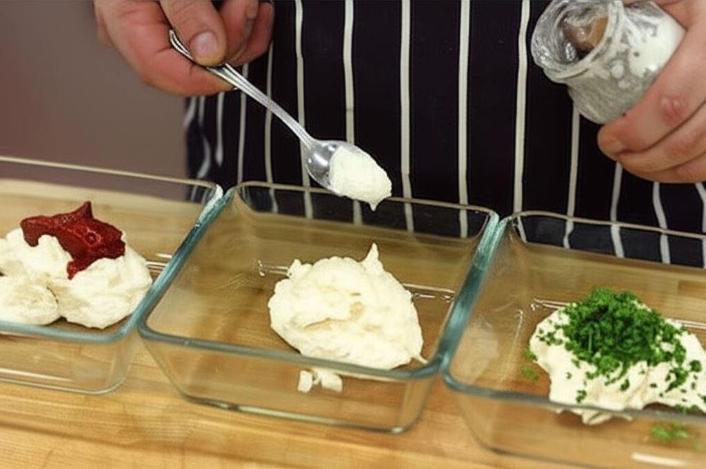 Rozdziel masę serową na trzy porcje: pierwszą połącz z chrzanem, drugą z koncentratem pomidorowym, a trzecią z drobno siekaną natką pietruszki.