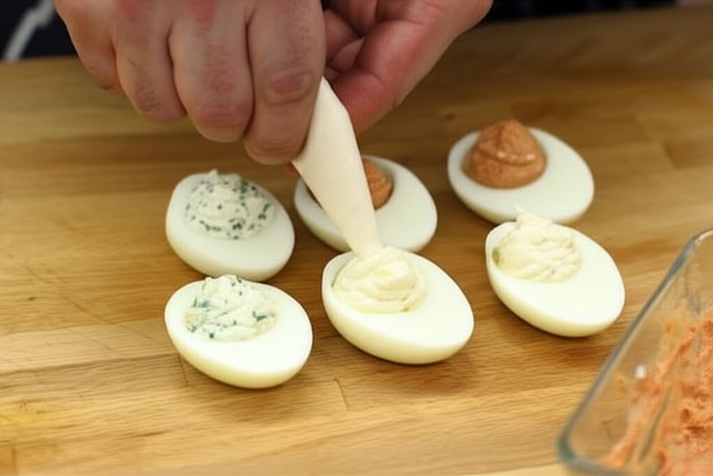 Wypełnij ozdobnie jajka przygotowanymi farszami.
