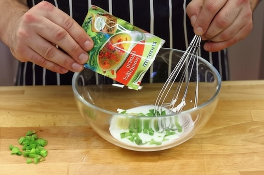Zawartość paczki Knorr wymieszaj z jogurtem, dodaj posiekany szczypiorek (2 kawałki zostaw do dekoracji) i starannie połącz.