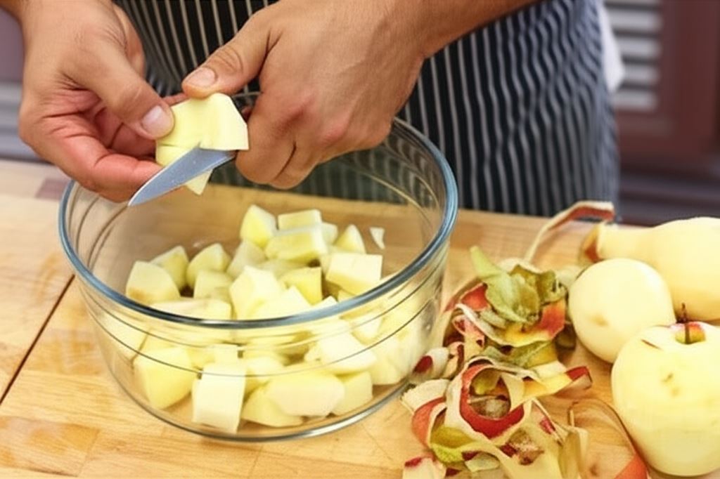 Zdejmij skórkę z jabłek i gruszek, następnie pokrój je na kawałki.