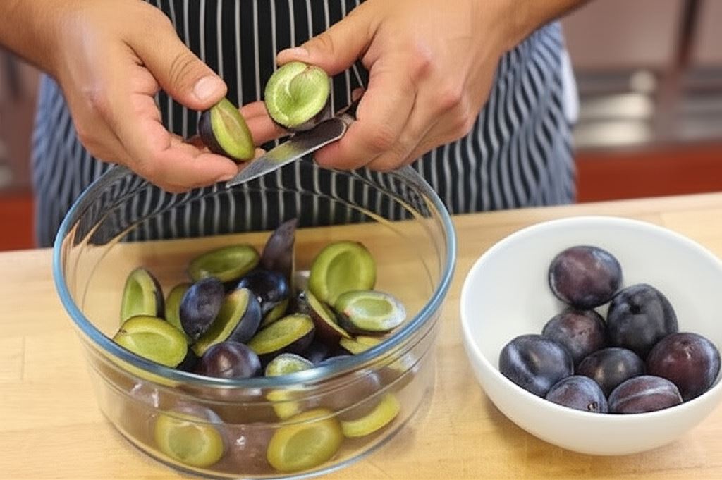 Śliwki opłucz, przekrój na połówki i wyciągnij pestki.