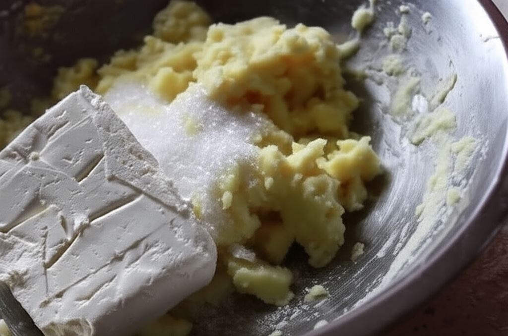 Twaróg w kostce rozgniotłam przy pomocy widelca, dodałam cukier i całość wymieszałam.