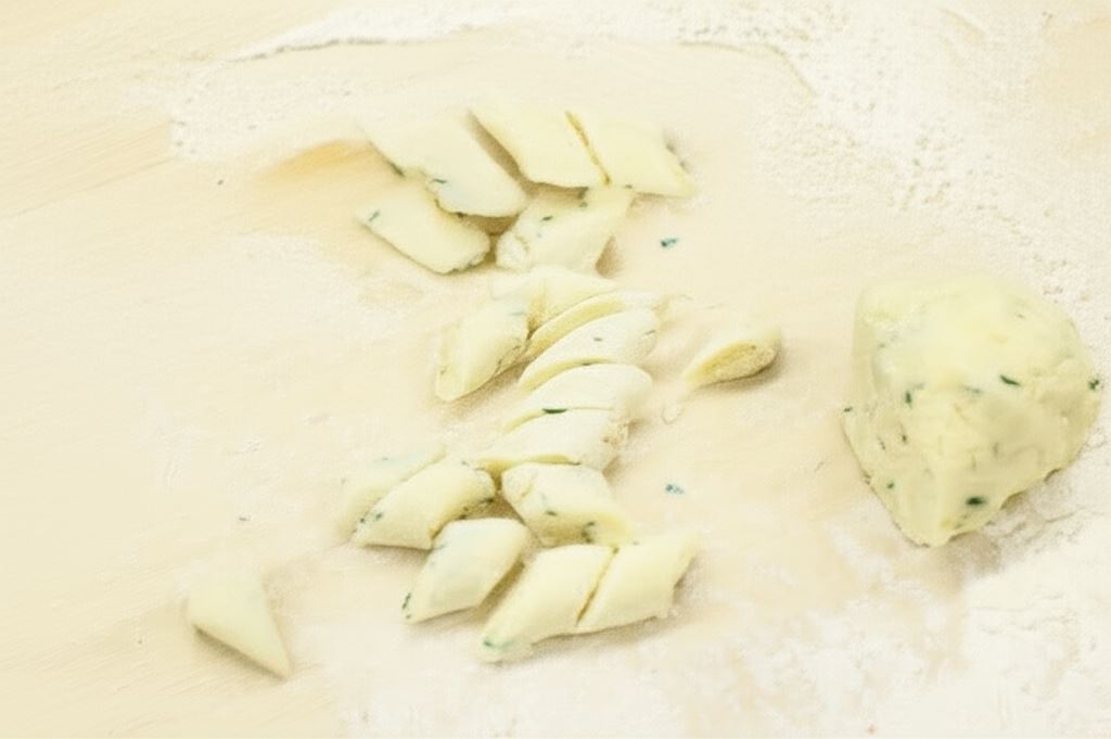 Uformuj w rękach wałeczki z ciasta (w razie potrzeby obsyp je dodatkową mąką), pokrój na kopytka i ugotuj w delikatnie osolonej wodzie około 2 minut.