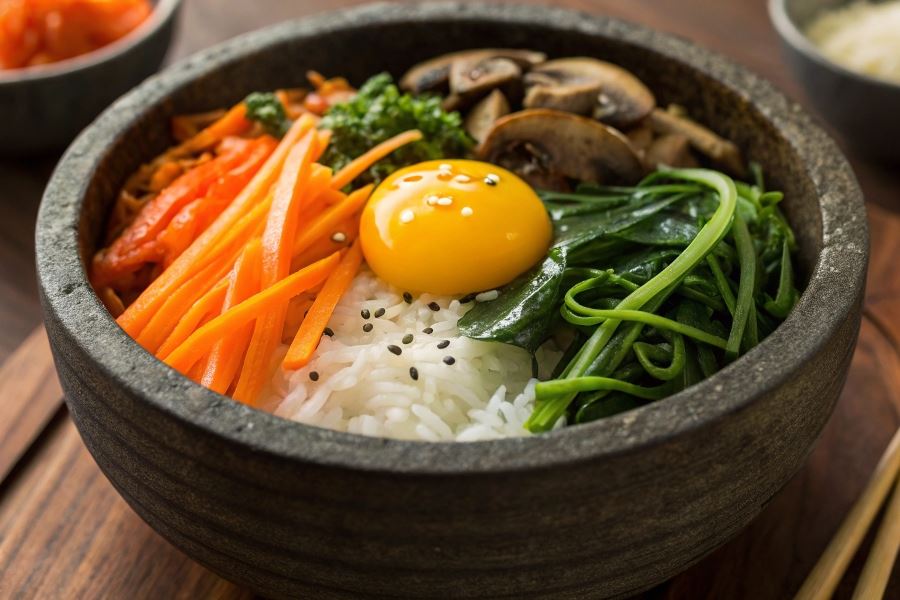 Dolsot Bibimbap – serwowany w rozgrzanym kamiennym naczyniu, dzięki czemu ryż na dnie staje się chrupiący. Ten wariant jest szczególnie popularny zimą ze względu na długo utrzymujące się ciepło potrawy.