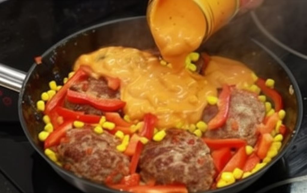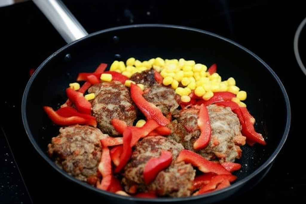 Umieść kotleciki w rondlu, wsyp drugą papryczkę pepperoni (pociętą w paski) oraz odcedzoną kukurydzę.