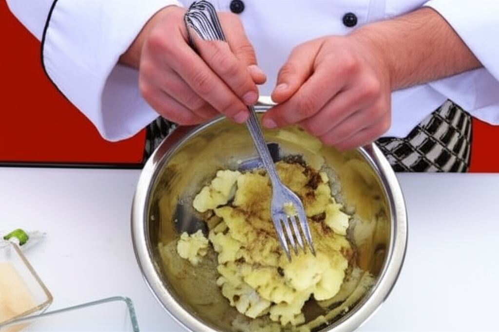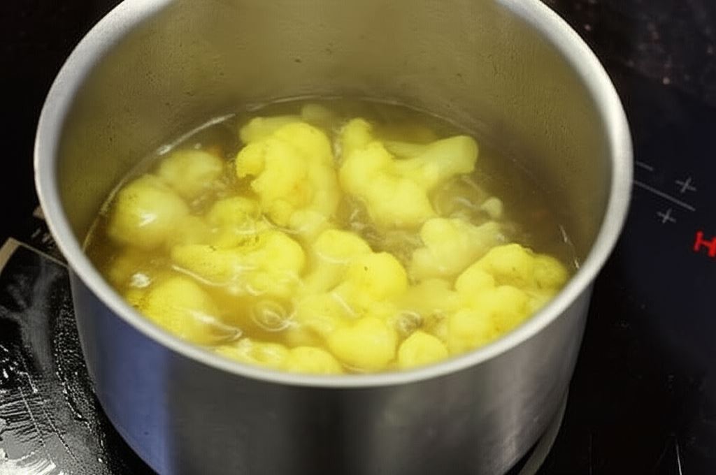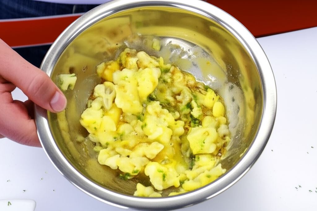 Podziel kalafior na różyczki i ugotuj w bulionie przez 15 minut. Odcedź i rozgnieć na puree widelcem. Odstaw do wystygnięcia.