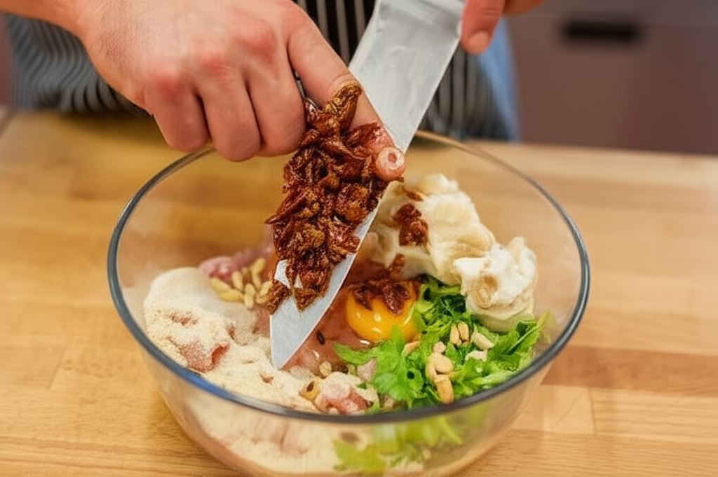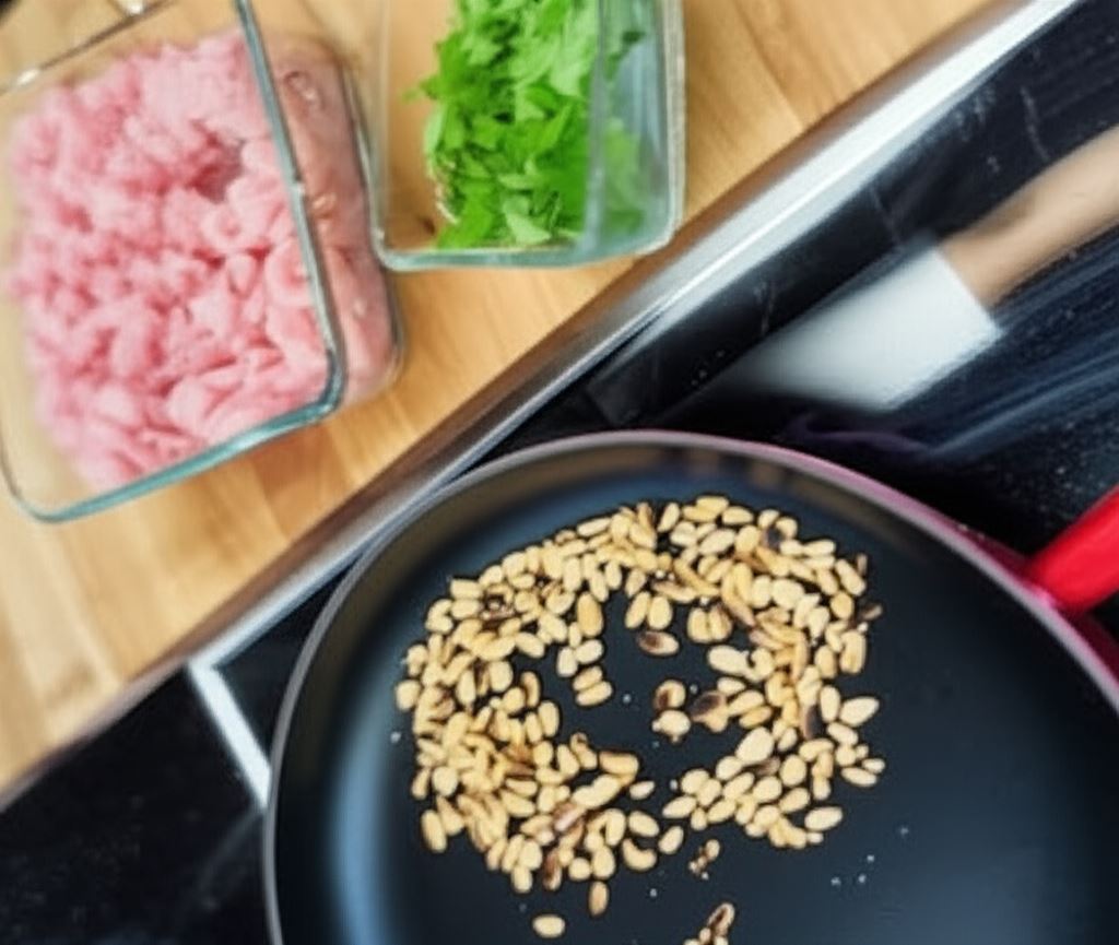 W naczyniu wymieszaj mięso, jajka, pomidory, orzeszki, odciśniętą bułkę, bułkę tartą i połowę kolendry. Całość przypraw przyprawą Knorr i starannie połącz.