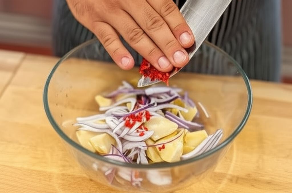 W tym czasie przygotuj sałatkę: karczochy podziel na ćwiartki, cebulę pokrój w piórka a chilli drobno posiekaj. Całość umieść w salaterce i wymieszaj.