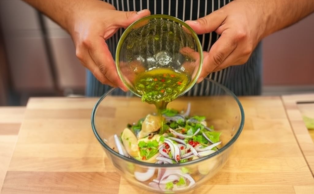 W miseczce połącz sos sałatkowy Knorr, oliwę, 3 łyżki zalewy z karczochów, chilli i kolendrę. Wszystko starannie wymieszaj i skrop przygotowaną sałatkę. Gotowe, ugotowane kotleciki serwuj z sałatką.