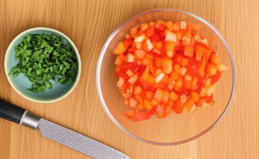 Paprykę pokrój w kosteczkę, natkę pietruszki posiekaj drobno. Zetrzyj ser na tarce o grubych oczkach.