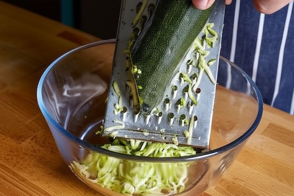 Cukinię zetrzyj na tarce z dużymi oczkami, delikatnie posól i odstaw do namięknięcia. Następnie wyciśnij dokładnie cukinię z nadmiaru płynu.