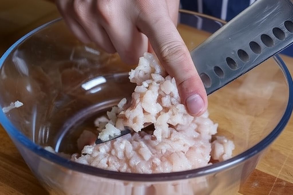 Mięso posiekaj przy pomocy noża i przełóż do miski.