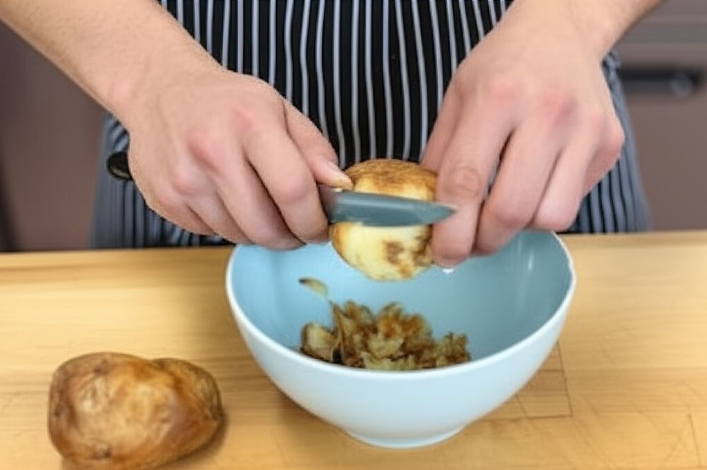 Ziemniaki upiecz w mundurkach w rozgrzanym do 180ºC piekarniku. Kiedy ziemniaki staną się miękkie, odstaw je do wystygnięcia. Następnie ziemniaki obierz i przepuść przez praskę do ziemniaków.