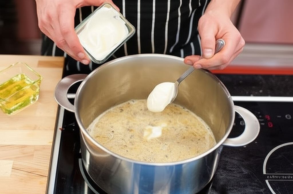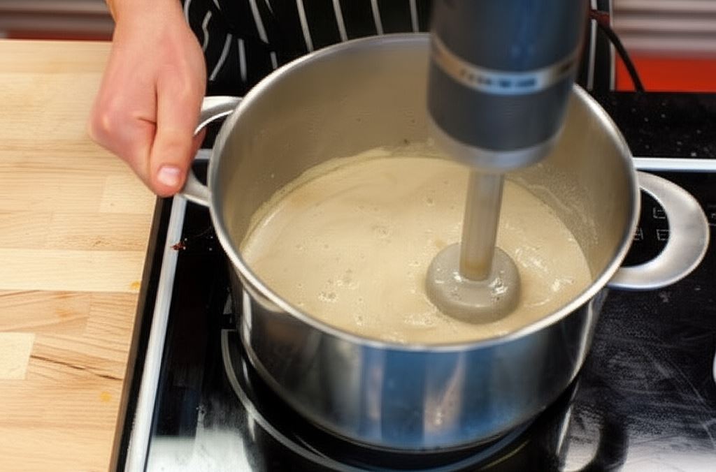 Przelej zupę do garnka i starannie zamieszaj. Wlej śmietankę i gotuj przez około 3 minut.