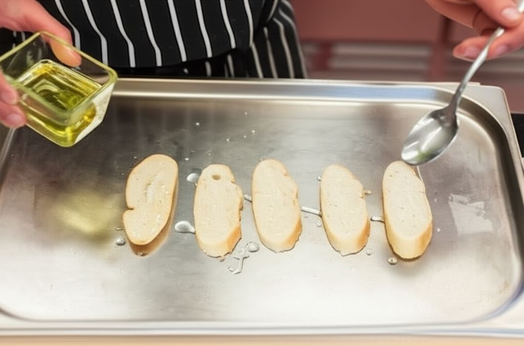 Każdą porcję bagietki polej łyżką aromatycznej oliwy i zapiekaj w piekarniku przez około 10 minut w temperaturze 180 °C.