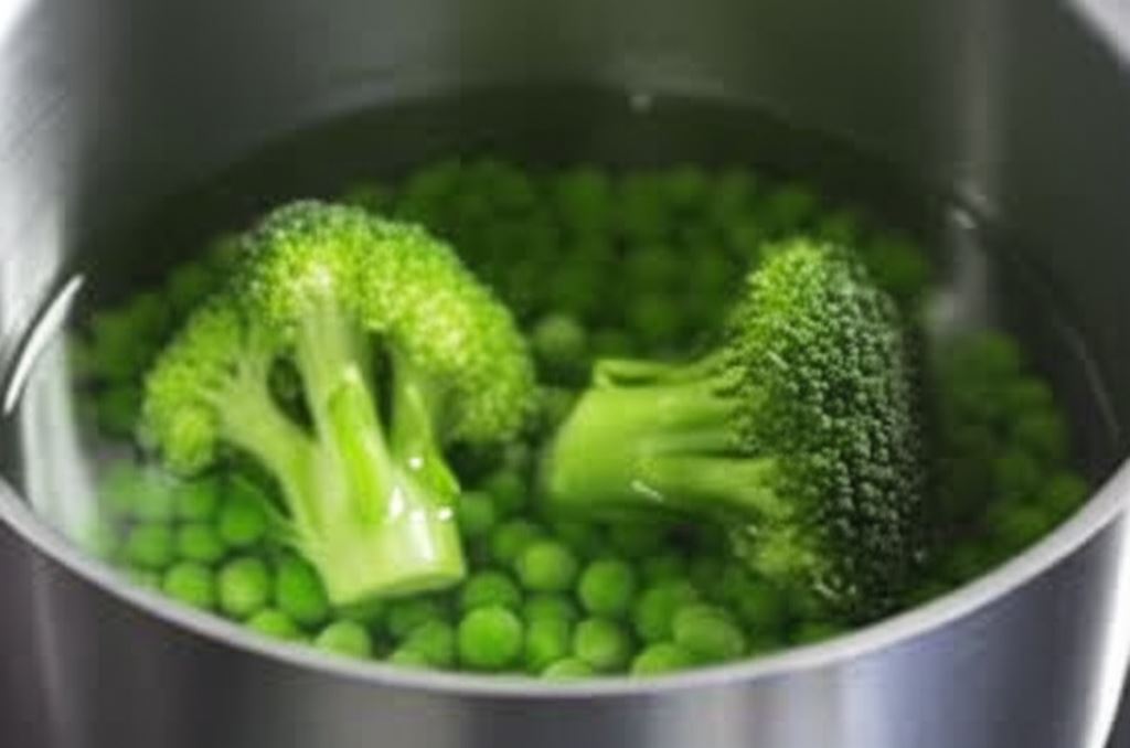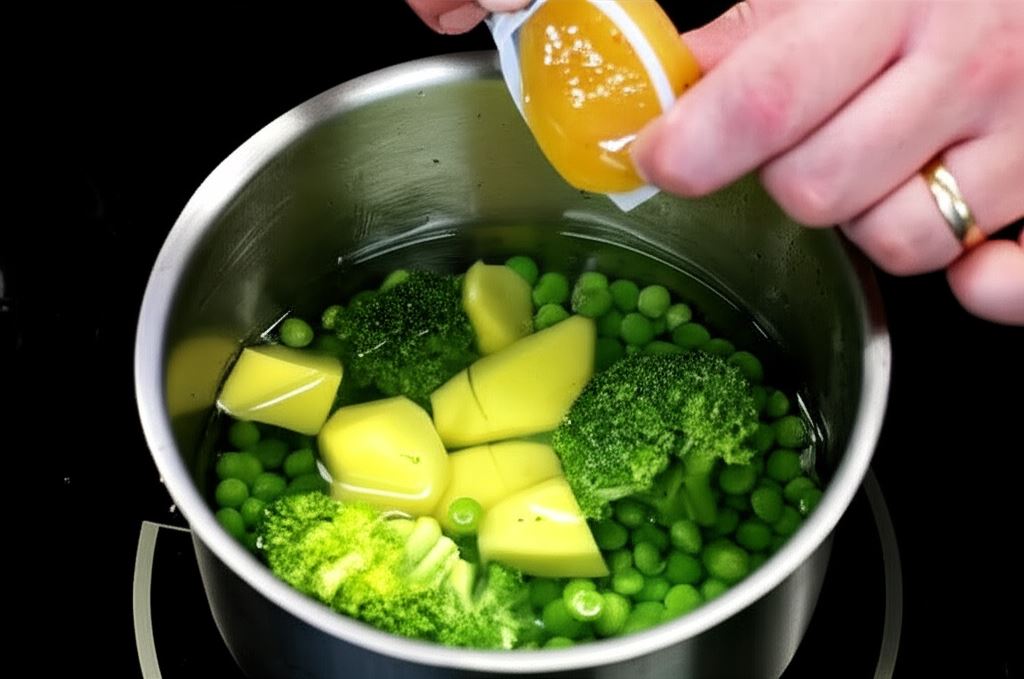 Groszek i brokuł umieść w sitku i opłucz wodą – nie trzeba ich odmrażać. Potem razem z ziemniakami dodaj je do rondelka.